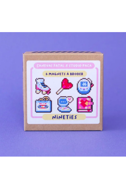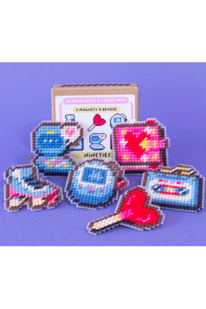 Ce kit permet de broder et d’assembler six magnets, vous aurez en plus besoin de ciseaux et d’un peu de colle liquide (glue ou néoprène)
