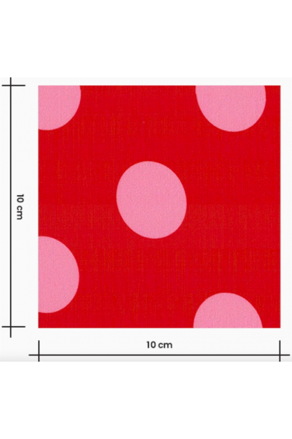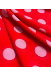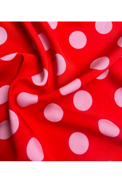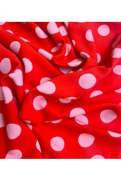 Viscose à pois, motif intemporel revisité dans une teinte fraise gourmande et assumée.