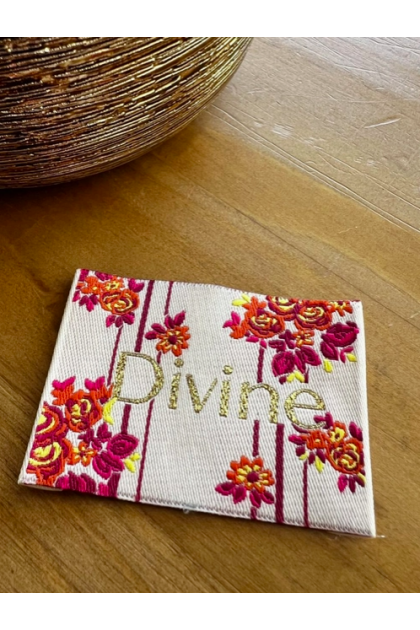 Divine Magnolia est une étiquette à coudre tissée en France au style floral éclatant et raffiné. Avec son fond écru, ses fleurs rose, fuchsia et orange, ainsi que son inscription dorée, elle apporte une finition lumineuse et élégante à toutes vos créations couture.