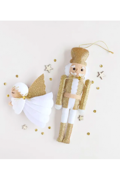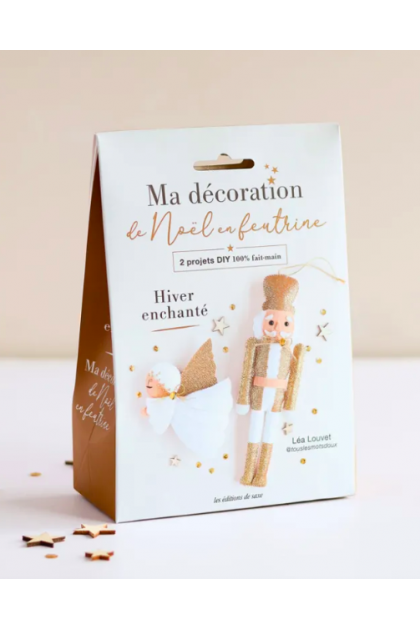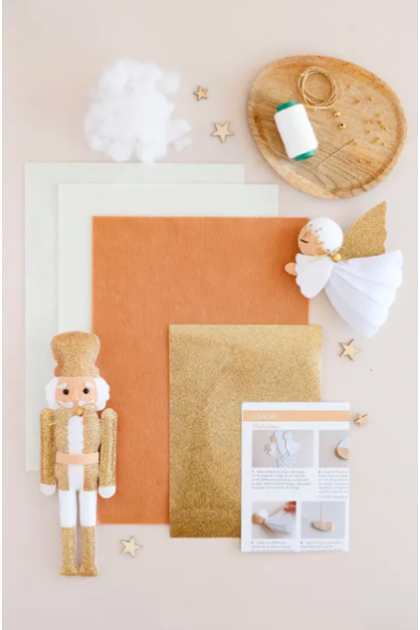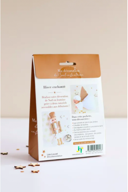 En effet, cette pochette contient non seulement le matériel (feuilles de feutrine, fils, embellissements…), mais également les tutos en photos pas à pas de 2 projets DIY simples à réaliser. Vous allez tomber sous le charme de ces modèles emblématiques des fêtes de fin d’année : un ange de Noël accompagné de l’incontournable Casse-Noisette à suspendre.