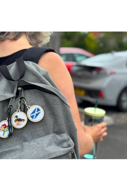 Ce mini kit de point de croix, fabriqué en Écosse, est présenté dans un format boîte d’allumettes au design amusant et moderne. Le coffret contient tout le nécessaire pour broder un motif sur tambour de 5 cm, avec porte-clés inclus !