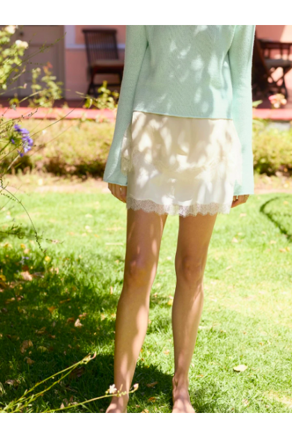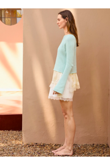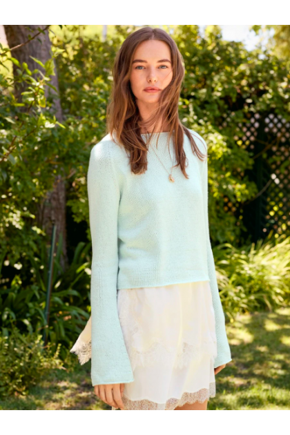 Tricotez le pull en jersey endroit, du col jusqu’en bas, avec des augmentations pour l’encolure raglan. Commencez par des rangs raccourcis pour former une encolure plus profonde, tout en augmentant les mailles pour l’encolure raglan devant et dos. Continuez les augmentations pour l’encolure raglan sur les manches, devant et dos, jusqu’à la fin, en augmentant uniquement les mailles pour l’encolure raglan sur les manches. Séparez devant, dos et manches et tricotez chaque partie séparément. Tricotez les manches avec des augmentations pour créer l’élégante forme trompette. Le pull a une coupe ajustée avec une aisance estimée entre 5 et 6 cm.